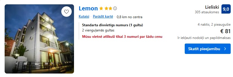 3* viesnīca Lemon. Divvietīgs numurs uz 4 naktīm – 81 EUR.
