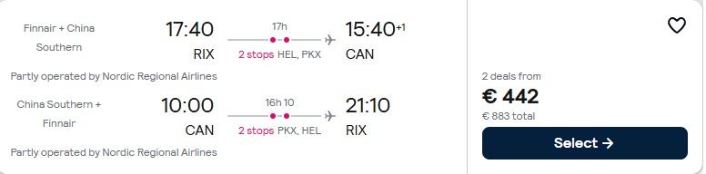 Finnair un China Southern lidojumi no Rīgas uz Guandžou ar pārsēšanos Helsinkos un Pekinā.