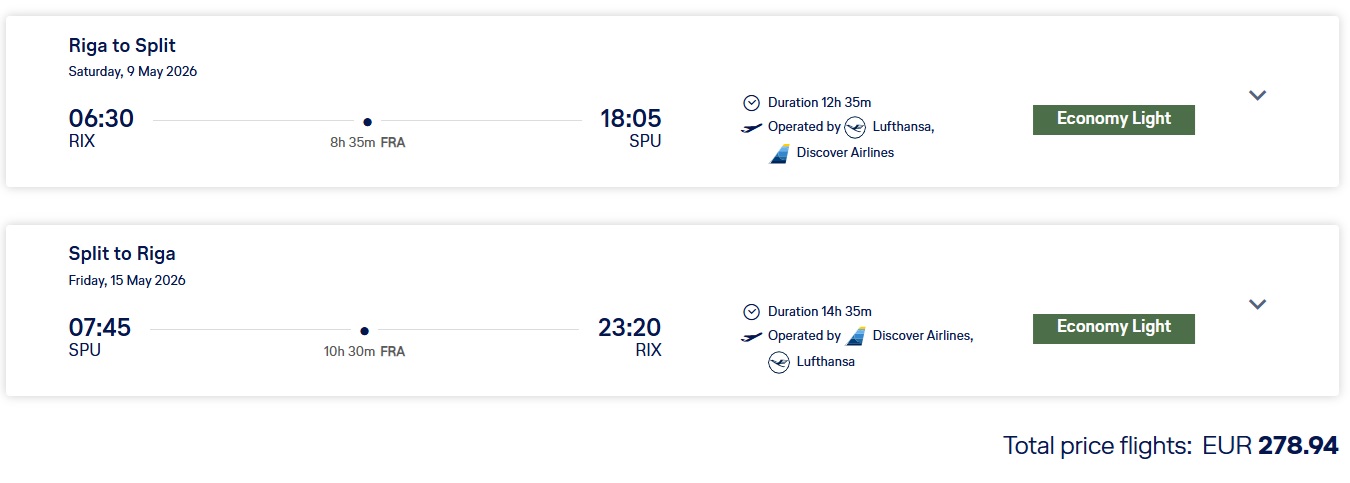 Lufthansa lidojumi no Rīgas uz Splitu ar pārsēšanos Frankfurtē.