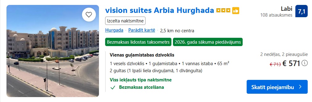 Apartamenti vision suites Arbia Hurghada uz 14 naktīm ar viss iekļauts ēdināšanu – 571 EUR.