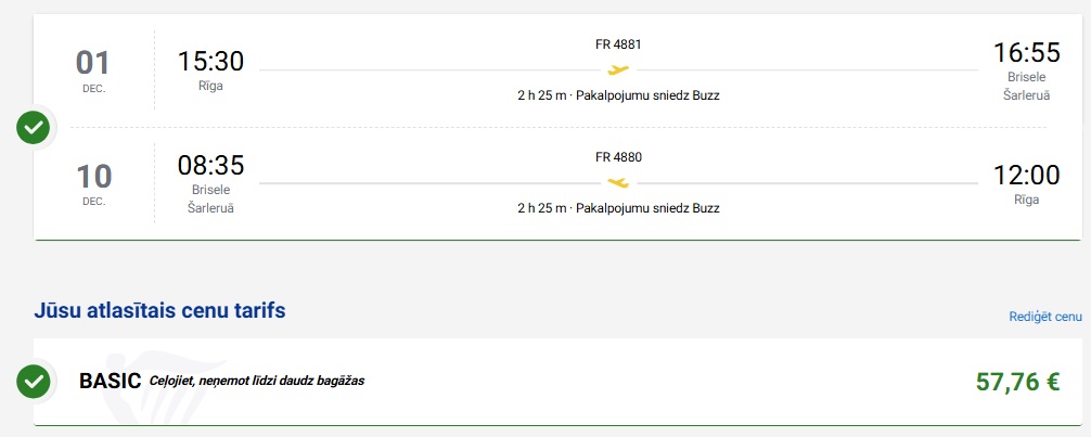Rīga – Brisele 1.12. un Brisele – Rīga 10.12. 58 EUR (vai 24.11.-3.12.)