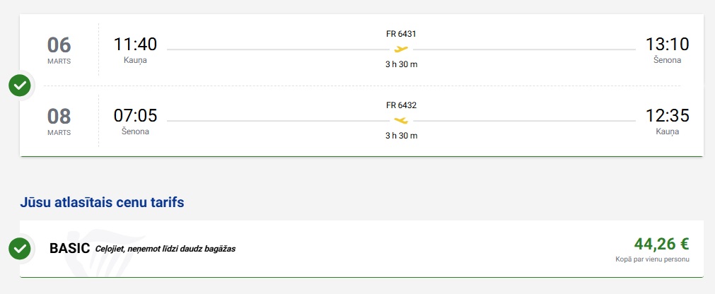 Tiešie Ryanair lidojumi no Kauņas uz Šenonu (cenā nav iekļauta bagāža).
