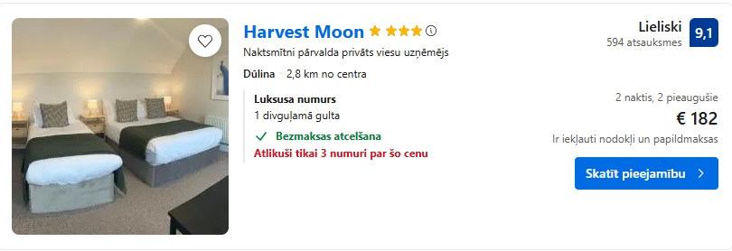 4* viesnīca Harvest Moon. Divvietīgs numurs uz 2 naktīm – 182 EUR.