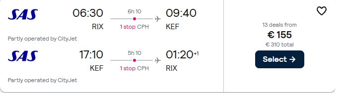 SAS lidojumi no Rīgas uz Reikjaviku ar pārsēšanos Kopenhāgenā.