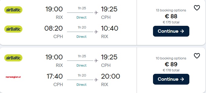 Tiešie Air Baltic vai Norwegian lidojumi no Rīgas uz Kopenhāgenu.
