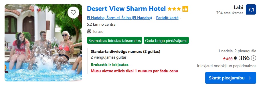 3* viesnīca Desert View Sharm Hotel. Divvietīgs numurs uz 7 naktīm ar brokastīm – 386 EUR.