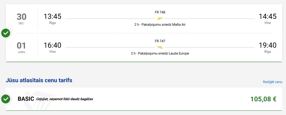 Tiešie Ryanair lidojumi no Rīgas uz Vīni (bagāža nav iekļauta cenā).
