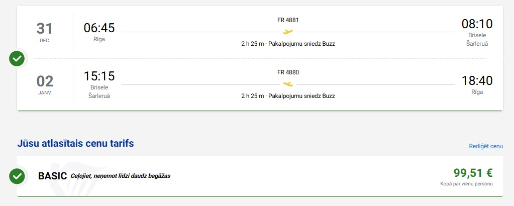 Tiešie Ryanair lidojumi no Rīgas uz Briseli (Charleroi). Cenā nav iekļauta bagāža.