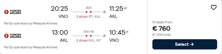 Turkish Airlines lidojumi no Viļņas uz Oklendu ar pārsēšanos Stambulā un Kualalumpurā.