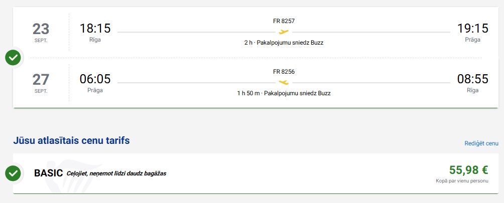 Tiešie Ryanair lidojumi no Rīgas uz Prāgu (cenā nav iekļauta bagāža).