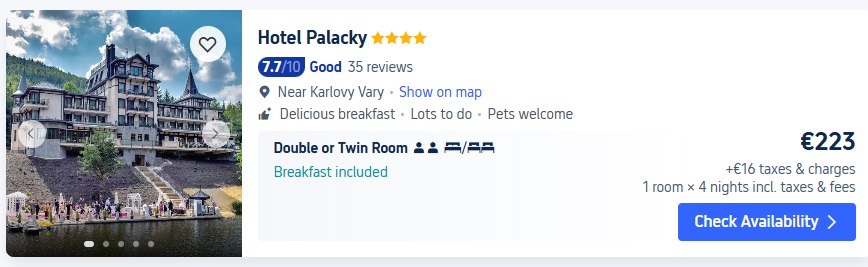 Viesnīca Palacky atrodas Karlovi Vari vēsturiskā spa pašā centrā, tieši pie promenādes. Viesnīcai ir eleganti numuri, skats uz vēsturisko pilsētu, kā arī restorāns, kur tiek pasniegti Vidusjūras virtuves ēdieni.