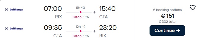 Lufthansa lidojumi no Rīgas uz Katāniju ar pārsēšanos Frankfurtē.