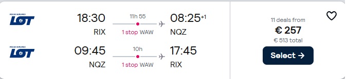Rīga – Astana piem. 6.-14.04. 257 EUR turp un atpakaļ