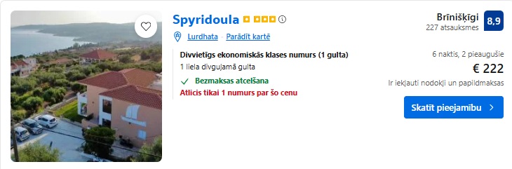 Viesnīca Spyridoula. Divvietīgs numurs uz 6 naktīm – 222 EUR.
