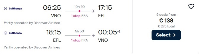 Lufthansa lidojumi no Viļņas uz Kefaloniju ar pārsēšanos Frankfurtē.