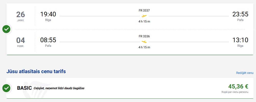 Tiešie Ryanair lidojumi no Rīgas uz Pafu (cenā nav iekļauta bagāža).