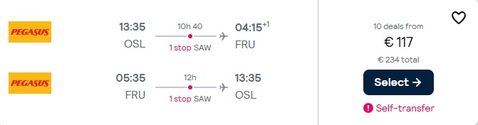 AirBaltic vai Norwegian lidojumi no Rīgas uz Oslo un Pegasus Airlines lidojumi no Oslo uz Biškeku ar pārsēšanos Stambulā.