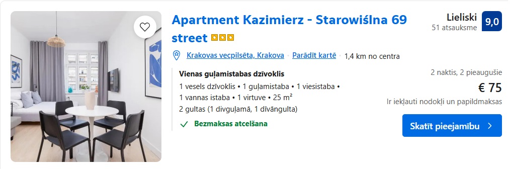 Apartamenti Apartment Kazimierz – Starowiślna 69 street uz 2 naktīm – 75 EUR.