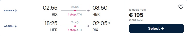 Aegean lidojumi no Rīgas uz Heraklionu/Irakliju ar pārsēšanos Atēnās.