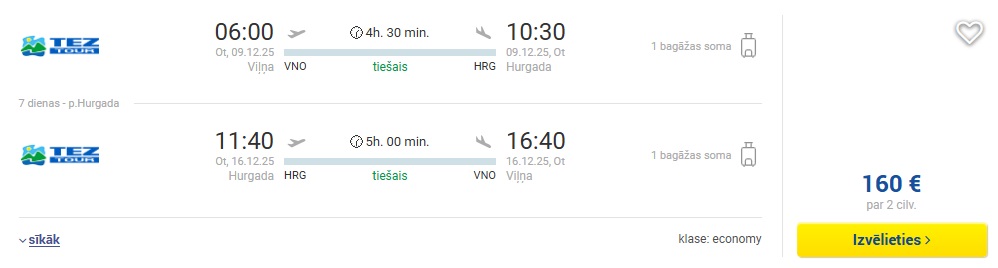 Datumi: 9.-16.12. 80 EUR turp un atpakaļ vienam cilvēkam vai 160 EUR diviem