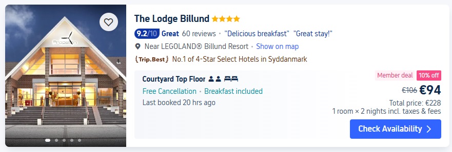 4* viesnīca The Lodge Billund. Divvietīgs numurs uz 2 naktīm ar brokastīm – 228 EUR.