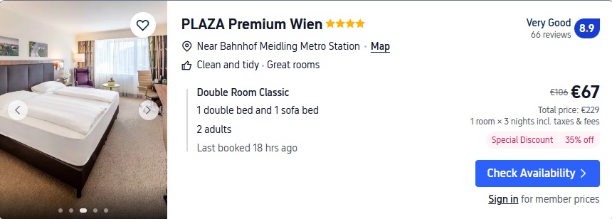 4* viesnīca PLAZA Premium Wien. Divvietīgs numurs uz 3 naktīm – 229 EUR.