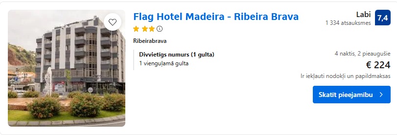 3* viesnīca Flag Hotel Madeira – Ribeira Brava. Divvietīgs numurs uz 7 naktīm – 406 EUR.