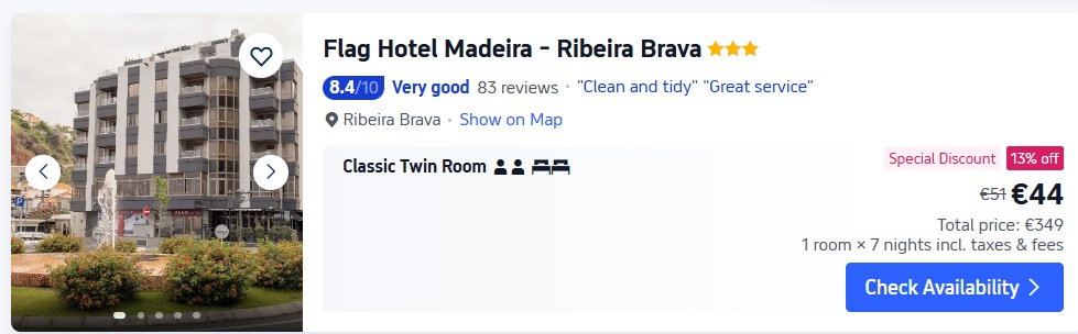 3* viesnīca Flag Hotel Madeira – Ribeira Brava. Divvietīgs numurs uz 7 naktīm – 349 EUR.