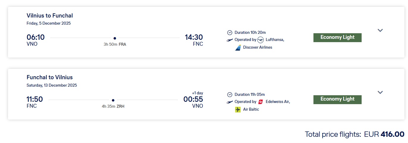 Lufthansa/Swiss lidojums no Viļņas uz Madeiru ar pārsēšanos Frankfurtē/Cīrihē.