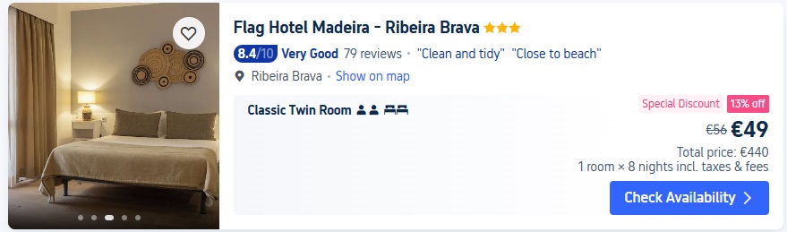 3* viesnīca Flag Hotel Madeira – Ribeira Brava. Divvietīgs numurs uz 8 naktīm – 440 EUR.