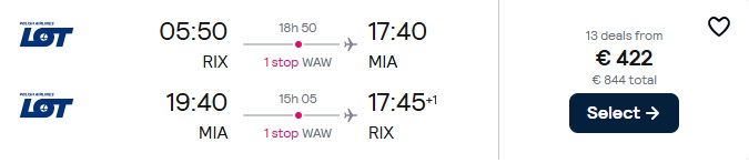 LOT lidojumi no Rīgas uz Maiami ar pārsēšanos Varšavā.