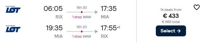 LOT lidojumi no Rīgas uz Maiami ar pārsēšanos Varšavā.