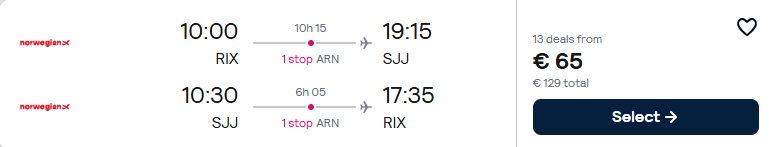 Norwegian lidojumi no Rīgas uz Sarajevu ar pārsēšanos Stokholmā (lidojumi nav savienoti).
