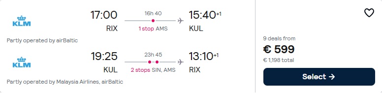 KLM lidojumi no Rīgas uz Kualalumpuru ar pārsēšanos Amsterdamā.