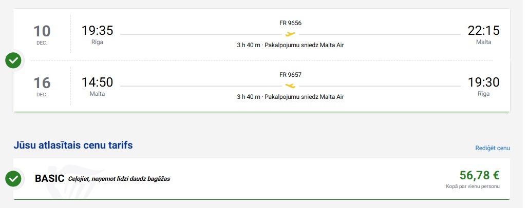 Rīga – Malta 10.-16.12. 58 EUR turp un atpakaļ vienam cilvēkam