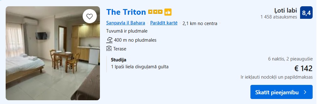 3* viesnīca The Triton. Studija uz 6 naktīm – 142 EUR.