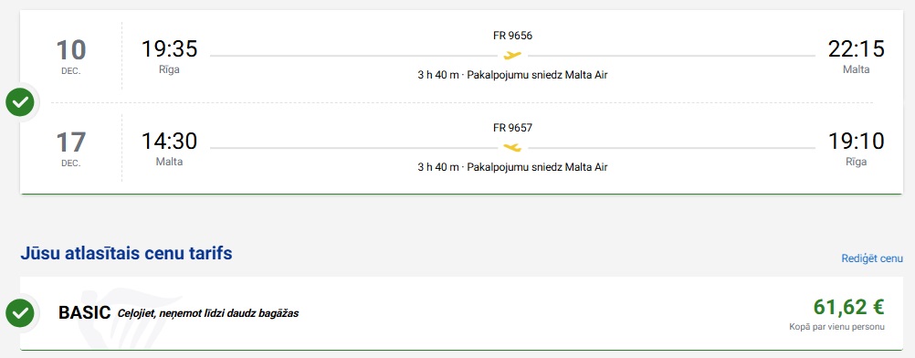 Rīga – Malta 10.-17.12. 62 EUR turp un atpakaļ vienam cilvēkam