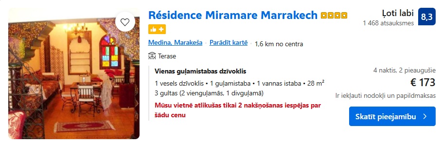 Rīga – Marakeša piem. 28.02.-4.03. 137 EUR turp un atpakaļ vienam cilvēkam