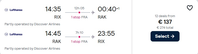 Lufthansa lidojumi no Rīgas uz Marakešu ar pārsēšanos Frankfurtē.