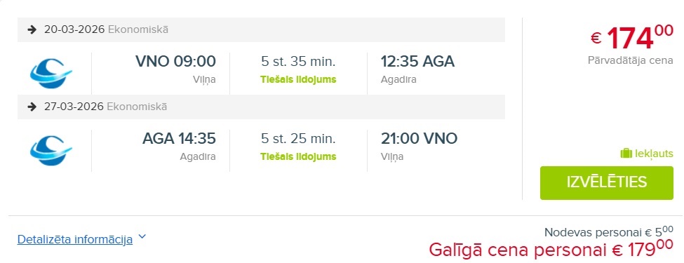 Datumi: 20.-27.03. 179 EUR turp un atpakaļ vienam cilvēkam