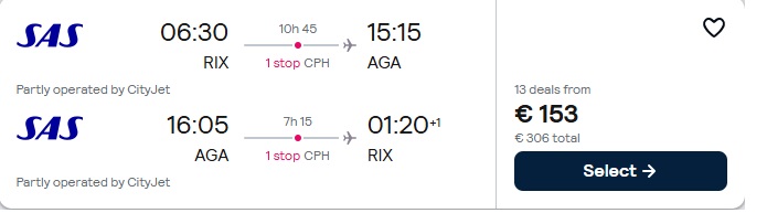 SAS lidojumi no Rīgas uz Agadiru ar pārsēšanos Kopenhāgenā.