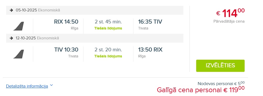 Rīga – Tivata 5.-12.10. 119 EUR turp un atpakaļ