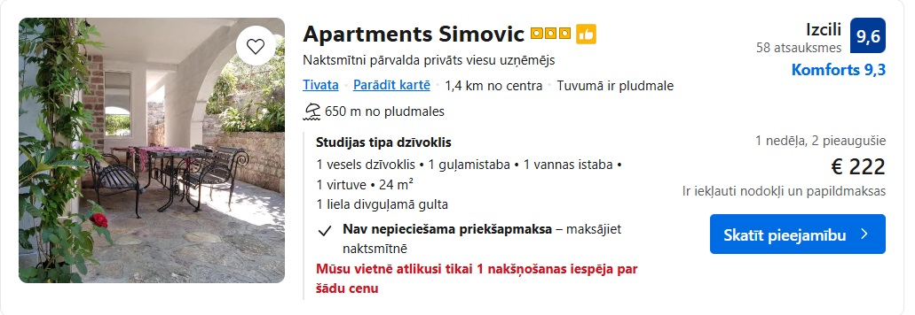 Apartamenti Apartments Simovic uz 7 naktīm – 222 EUR.