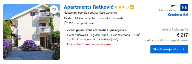 Apartamenti Apartments Ratković uz 7 naktīm – 217 EUR (uz 3 naktīm – 93 EUR).