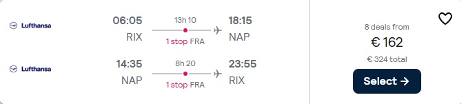 Lufthansa lidojumi no Rīgas uz Neapoli ar pārsēšanos Frankfurtē.