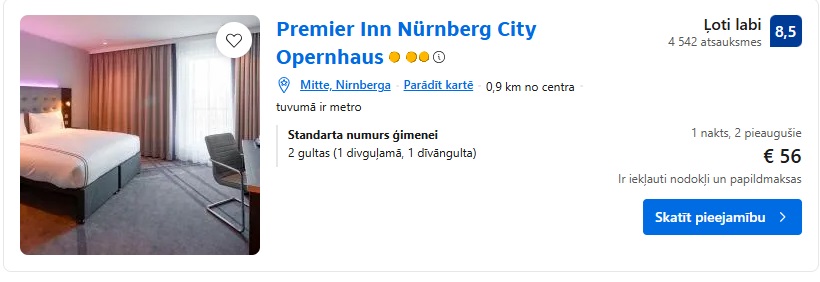 3* viesnīca Premier Inn Nürnberg City Opernhaus. Divvietīgs numurs – 56 EUR.