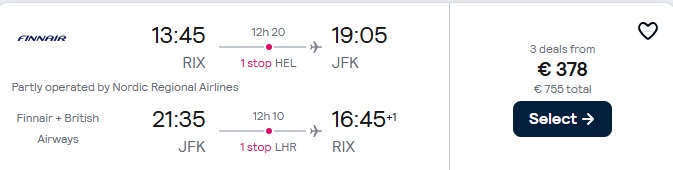 Finnair/British Airways lidojumi no Rīgas uz Ņujorku ar pārsēšanos Helsinkos vai Londonā.