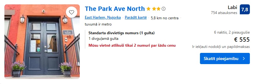 3* viesnīca The Park Ave North. Divvietīgs numurs uz 6 naktīm – 555 EUR.