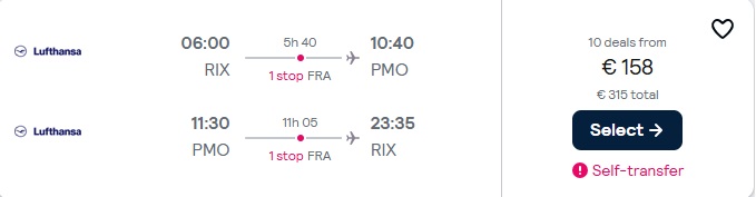 Lufthansa lidojumi no Rīgas uz Palermo ar pārsēšanos Frankfurtē.