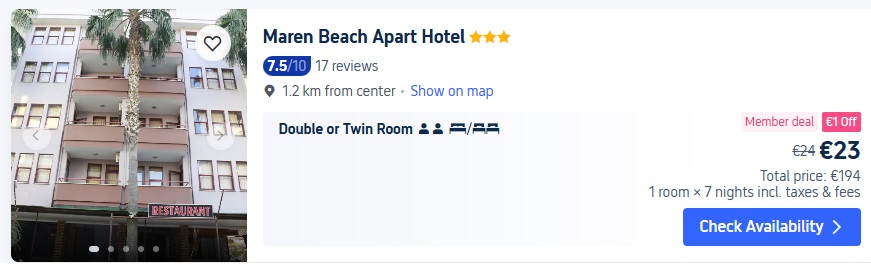 3* viesnīca Maren Beach Apart Hotel. Divvietīgs numurs uz 7 naktīm – 194 EUR.